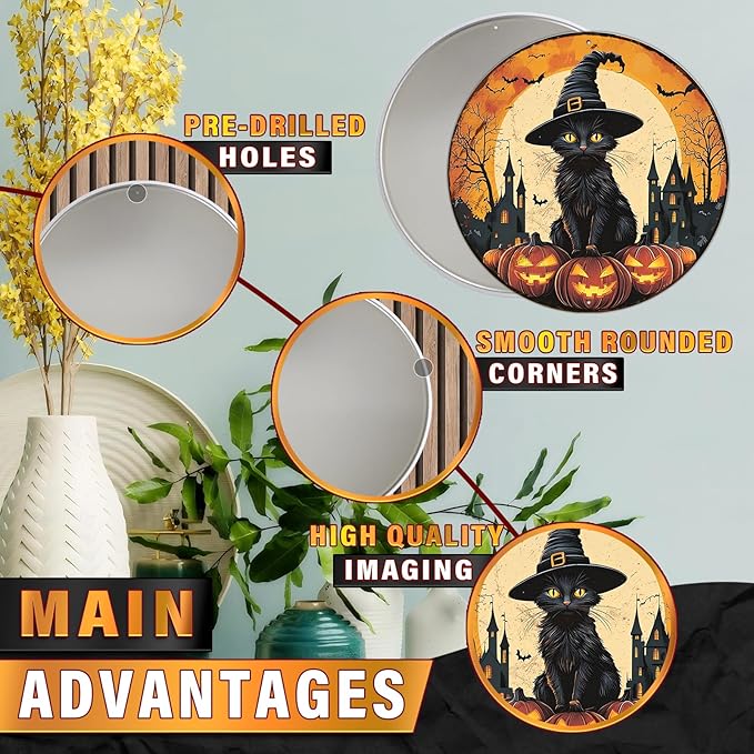 PEACHGARDEN Round Black Cat With Bats On Pumpkin Vintage Sign Halloween Metal Tin Sign for Home Bar Kitchen Hotel Dining Room Coffee 8x8inch