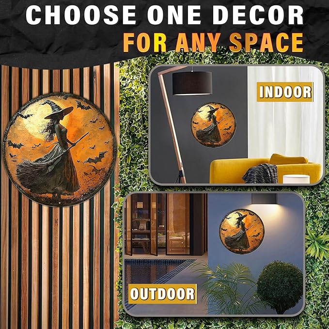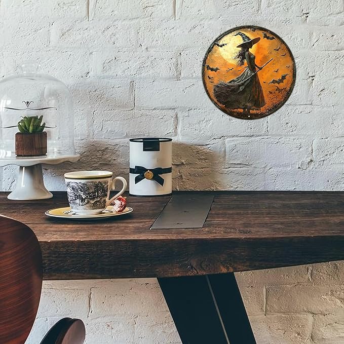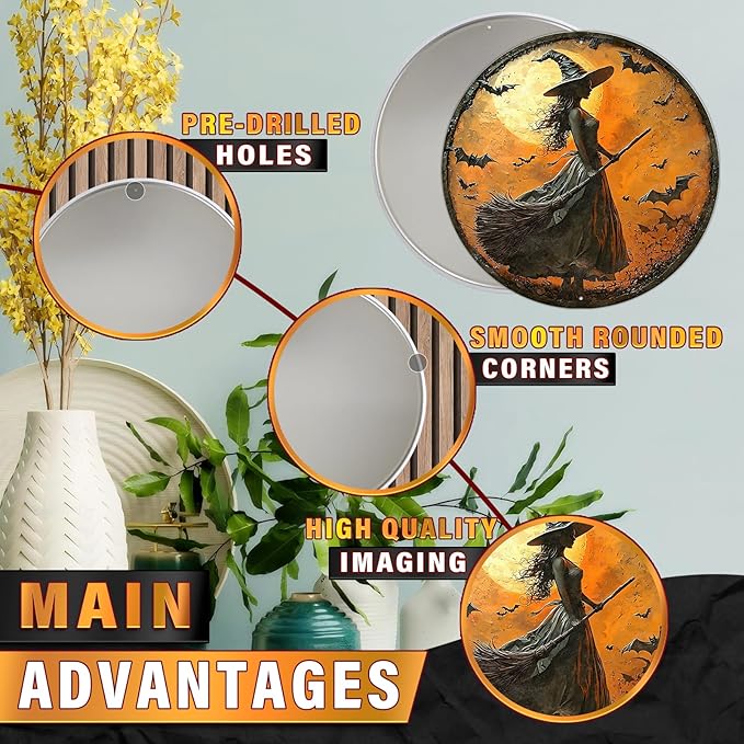 PEACHGARDEN Round 2D Halloween Witch Vintage Sign Halloween Witch Broom Metal Tin Sign for Home Bar Kitchen Hotel Dining Room Coffee 8x8inch