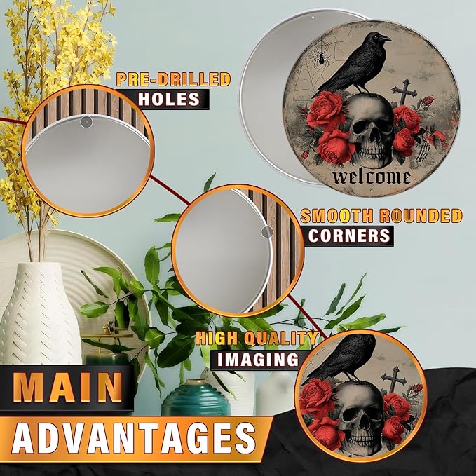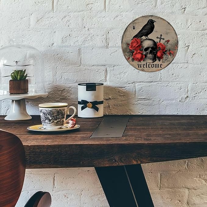PEACHGARDEN Halloween Skull Crow Metal Tin Sign Vintage Gothic Skeleton Decor Spooky Welcome Door Plaque Retro Wall Art Iron Painting for Home Bar Pub 8x8inch