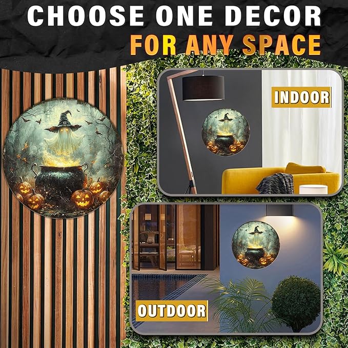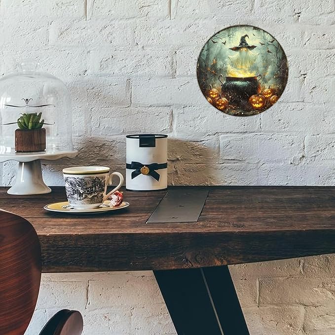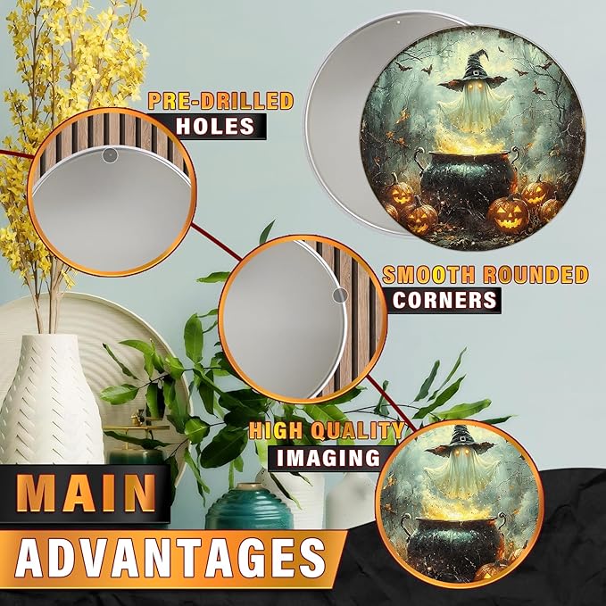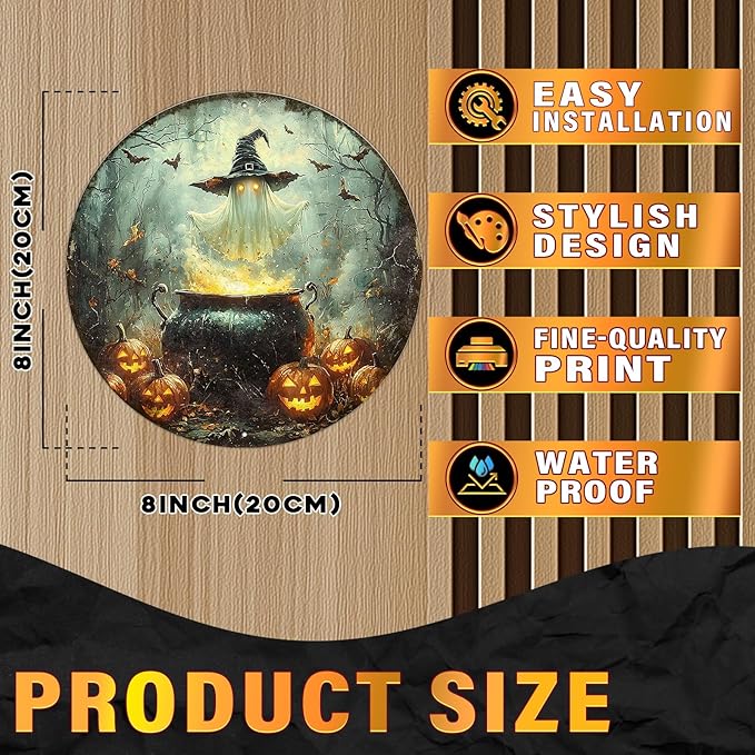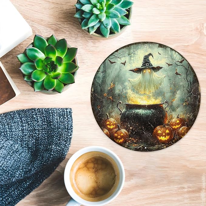 PEACHGARDEN Round Halloween Spooky Ghost With Witch Hat Wreath Vintage Sign Halloween Pumpkin Metal Tin Sign for Home Bar Kitchen Hotel Dining Room Coffee 8x8inch