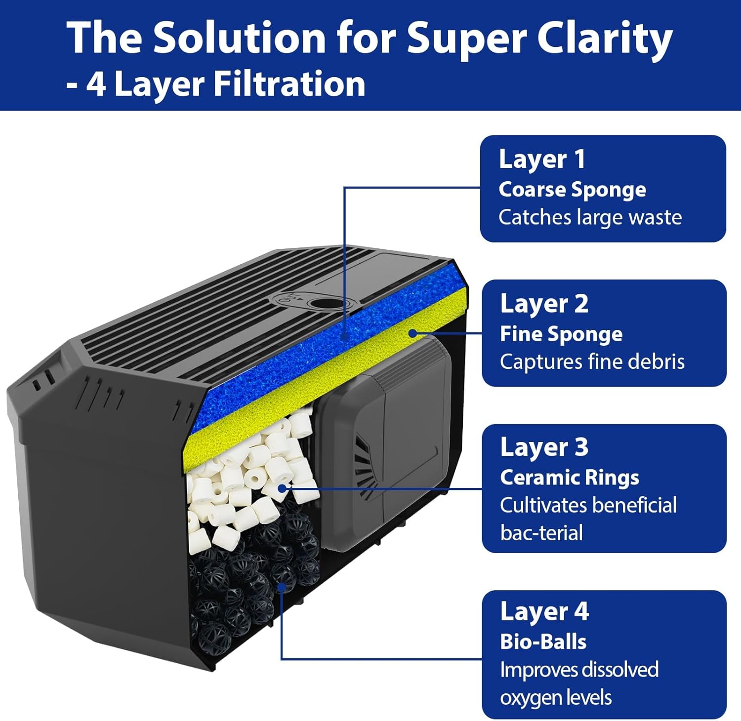 - 4-LAYER FILTRATION β Achieve crystal-clear water with this advanced pond filter box. Its 4-layer filtration process includes: Layer 1 β Coarse Sponge (traps large debris), Layer 2 β Fine Sponge (captures fine particles), Layer 3 β Ceramic Rings (Cultivates bene-ficial bac-te-ria), and Layer 4 β Bio-balls (Improves oxygen levels). Perfect for maintaining a clean and healthy pond environment.