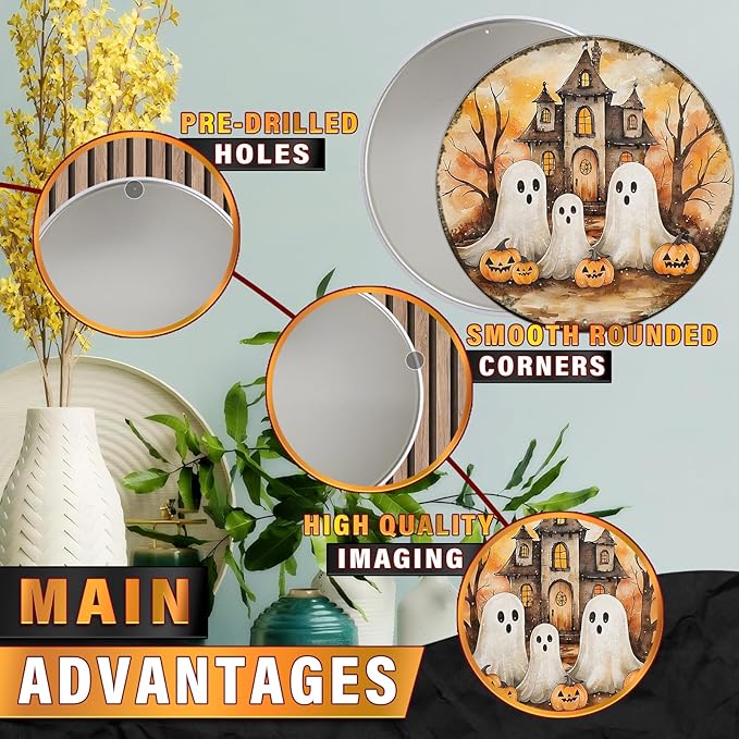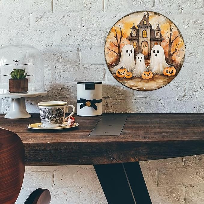 PEACHGARDEN Round Cute Ghost Halloween Vintage Sign Halloween Pumpkin Metal Tin Sign for Home Bar Kitchen Hotel Dining Room Coffee 12x12inch