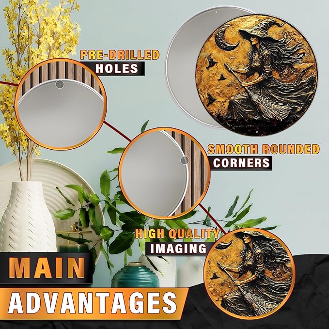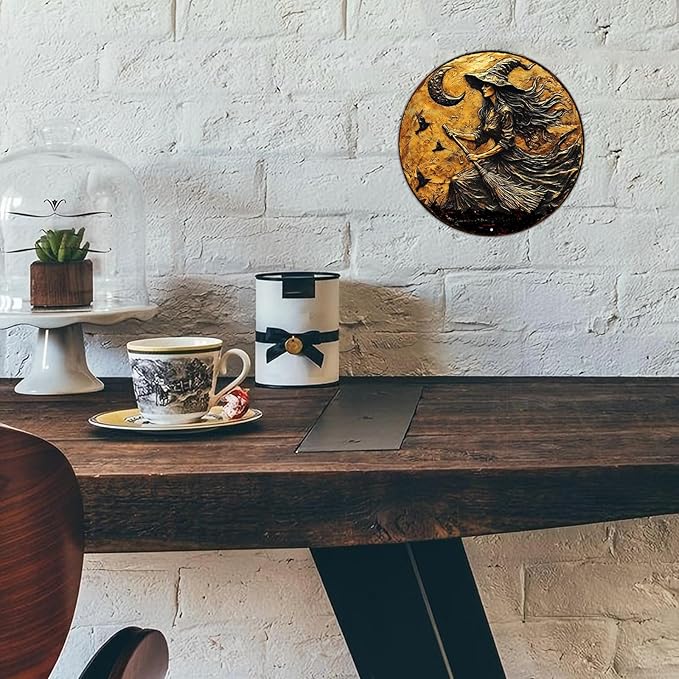 PEACHGARDEN Round 2D Halloween Witch Broom Vintage Sign Halloween Witch Metal Tin Sign for Home Bar Kitchen Hotel Dining Room Coffee 8x8inch