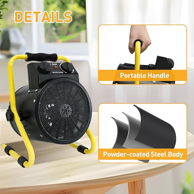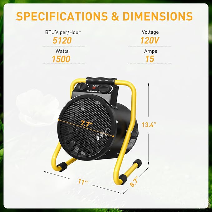 - EFFICIENT, HIGH-PERFORMANCE HEATING: With a robust 1500W output, this heater quickly and evenly warms enclosed areas up to 150 sq. ft., making it an ideal choice for greenhouses, garages, grow tents, sheds, RVs, and small indoor spaces