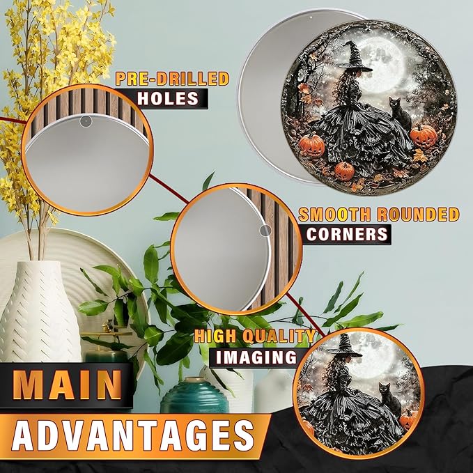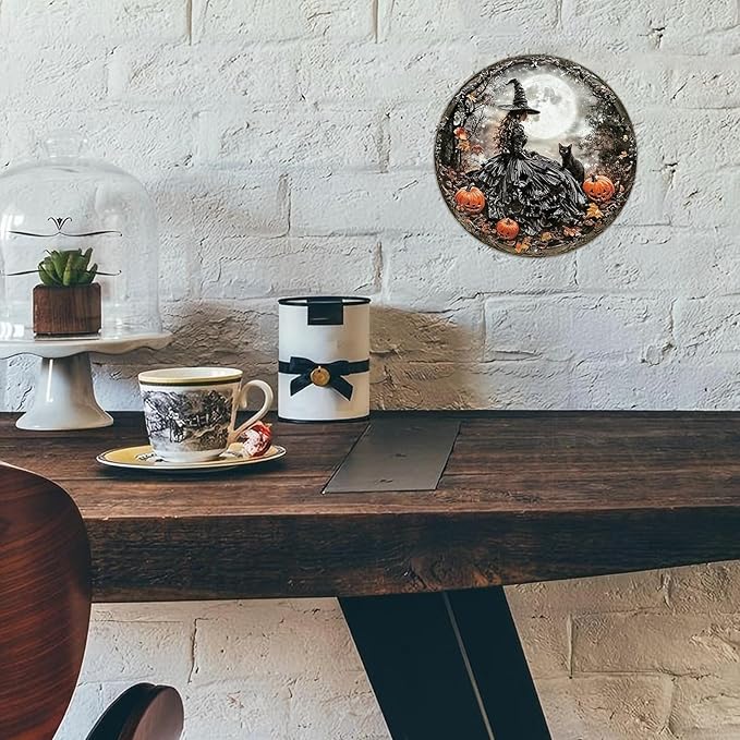 PEACHGARDEN Round Happy Halloween Black Cat Vintage Sign Halloween Witch Metal Tin Sign for Home Bar Kitchen Hotel Dining Room Coffee 8x8inch