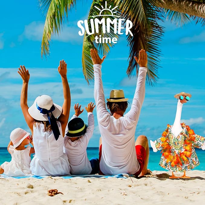 - Summer &Hawaiian Style:This yard goose outfits are designed in Hawaiian style, adorned with flower garlands, sunglasses, and a sun hat,addingng to the summer atmosphere. Its vibrant colors catch the eye, adding a bright spot to your lawn, garden, or backyard. Dress up your cement or plastic goose, and it will instantly become an outdoor focal point.