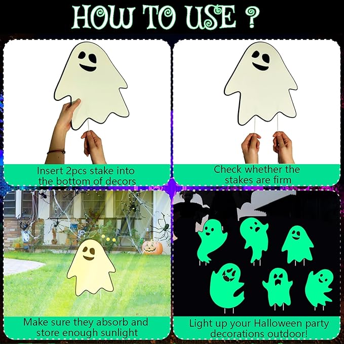 - 【Eerie Nighttime Glow】 These light-up ghost yard stakes absorb sunlight or artificial light during the day and emit a haunting glow at night, creating a supernatural ambiance for Halloween yard decorations. Perfect for ghost cemetery yard signs or indoor haunted house setups.