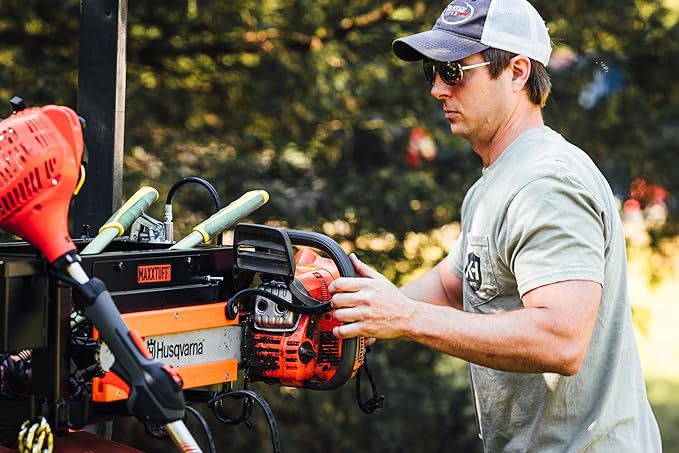 - Features new chainsaw holder with rubber retention strap on the front of the basket, plus a grease gun rack on the side