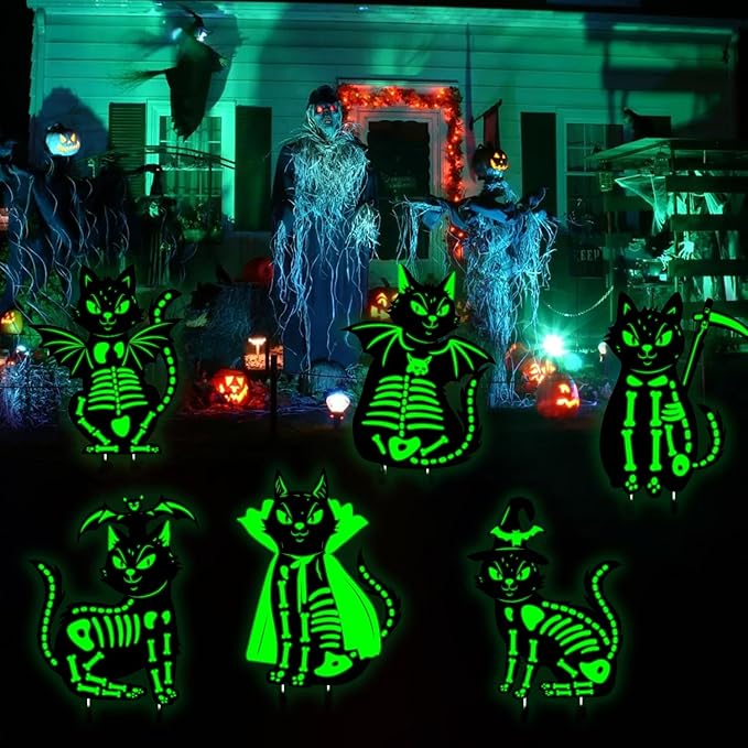 Outdoor Halloween Cat Decor, 6Pcs 16.5”×12.6” Glow in the Dark Black Cat Yard Stake, Waterproof Scary Porch Graveyard Decoration with Light-Up Effect, Suitable for Garden, Party and Home Decor