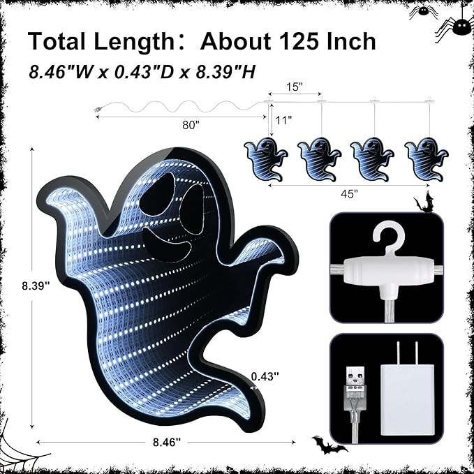 - Halloween Decor Light: Features 4 ghosts designs, each measuring 8.46" W x 0.43"D x 5.68" H and can project an eerie white infinity glow. With its 10.42ft length and built-in hooks on the rope, you can easily hang it anywhere