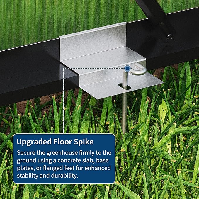- 【Our Competitiness】We upgrade your greenhouse with heavy duty ground spikes and reinforced aluminum construction. The ground nails provide a secure anchor for various terrains, while the robust aluminum frame ensures superior strength and weather resistance. Designed for year-round use, this combination delivers unmatched stability and longevity. Perfect for creating a reliable and efficient growing space! Elevate your greenhouse experience with this premium, long-lasting solution
