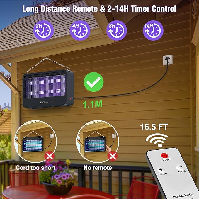 - 【Remote and Hanging Design】Mosquito Killer comes with a hanging chain that allows for easy setup in a variety of locations.Equipped with a remote control, you can turn the unit on or off from a distance without needing to approach it. Its 5.45-ft long cord makes it easy to hang in any spot, offering versatility for both indoor and outdoor insect control.