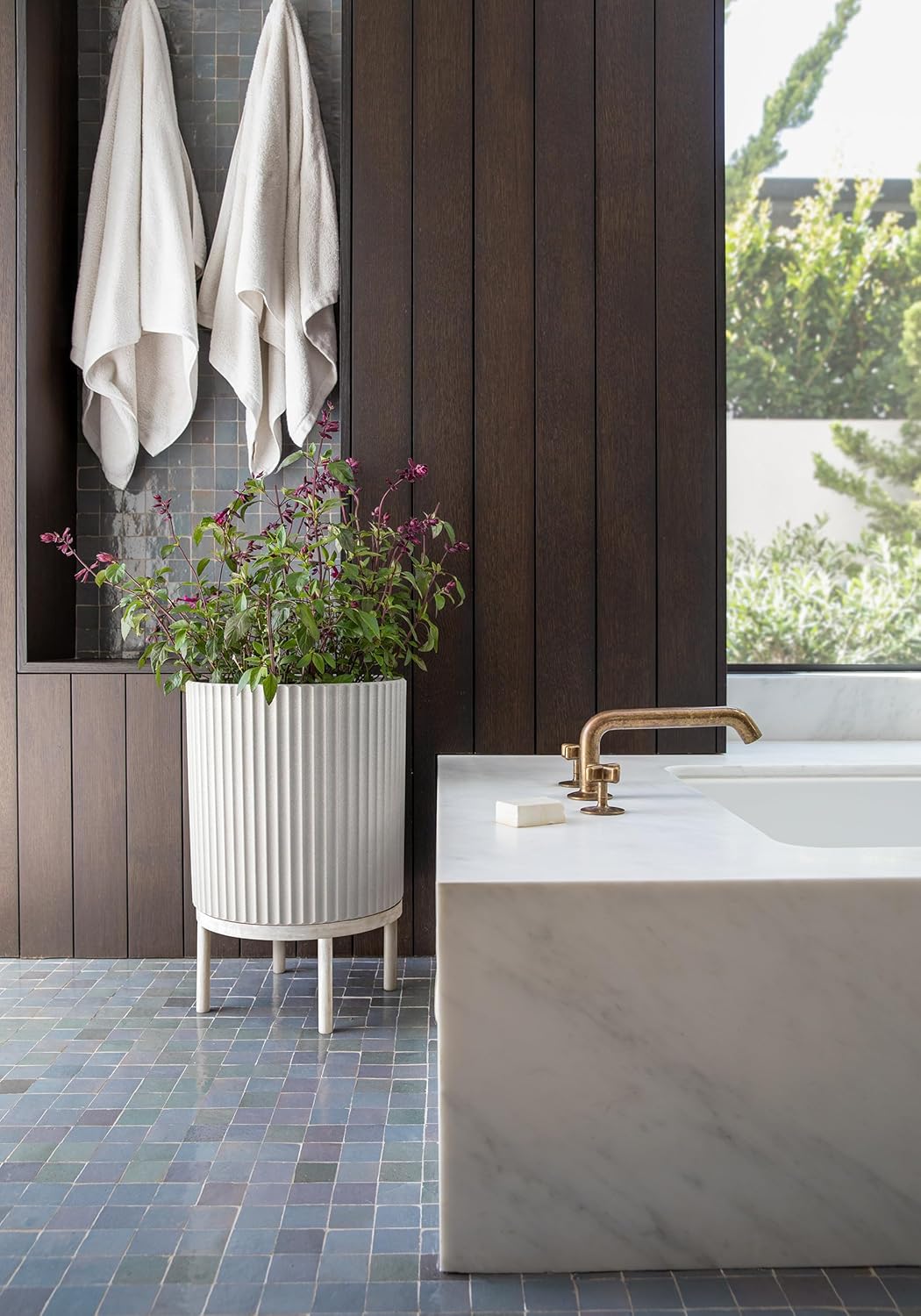 Veradek Demi Series Round Planter w/Stand for Porch/Patio | Durable Plastic-Stone Composite & Wooden Stand | Modern Décor for Tall Plants, Flowers