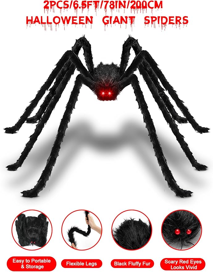 - 2PCS/6.5FT/78IN/200CM LARGEST HAIRY SPIDER - There are 2Pcs 6.5Ft long giant spiders for Halloween decorations outdoor scary, Super huge size and lightweight, 200 cm/78Inch in full expanded length. This creepy spider is so huge and realistic makes it great for Halloween indoor or outdoor decorating.
