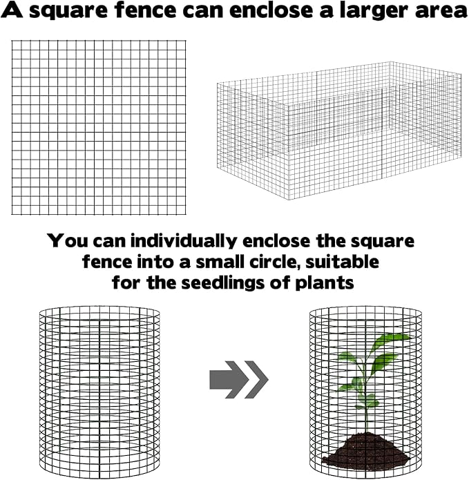 - DIY Plant Cage In Various Shapes: You can assemble 1 mesh into a small cylinder assembled plant cage, 2 or 3 pieces into a large cylinder protection cage, or even more mesh into a larger plant wire cage to protect your plants from harm, use the wire ties included in the package to tie up, circle the plant and then fix it with metal stakes, very simple to install and easy to use.
