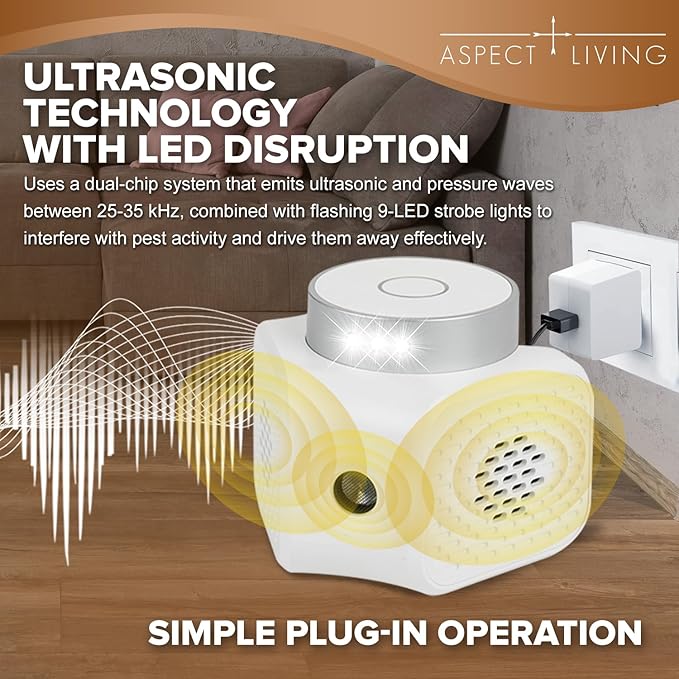 - Ultrasonic Technology with LED Disruption-Uses a dual-chip system that emits ultrasonic and pressure waves between 25-35 kHz, combined with flashing 9-LED strobe lights to interfere with pest activity and drive them away effectively.
