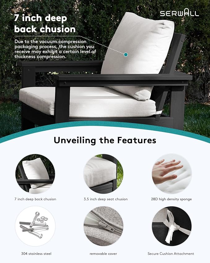 - Enhanced Comfort: Our patio sofa set features premium, 3.5-inch thick high-density foam cushions, providing unparalleled comfort and support during those long hours of relaxation or socializing. With an extra thick 7-inch pillow for the backrest, you can rest assured that your seating experience will be nothing short of luxurious.