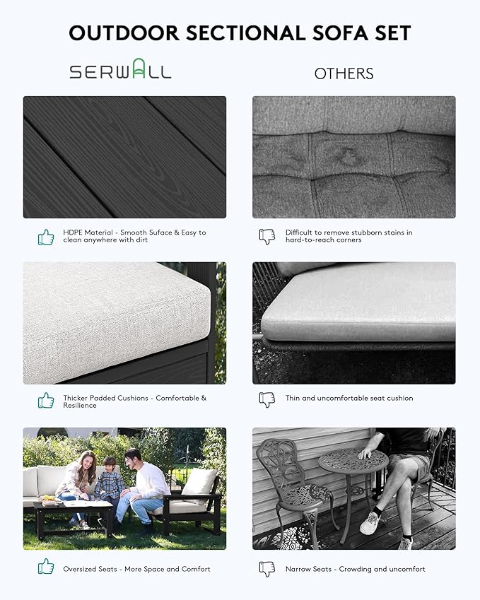 - 1000 Days Trial: Your satisfaction is our top priority. We are committed to providing excellent customer service and support. Each of our 8-piece patio sofa sets comes with SERWALL's assurance of quality and customer satisfaction. If you have any questions or concerns, our dedicated customer service team is ready to assist you.