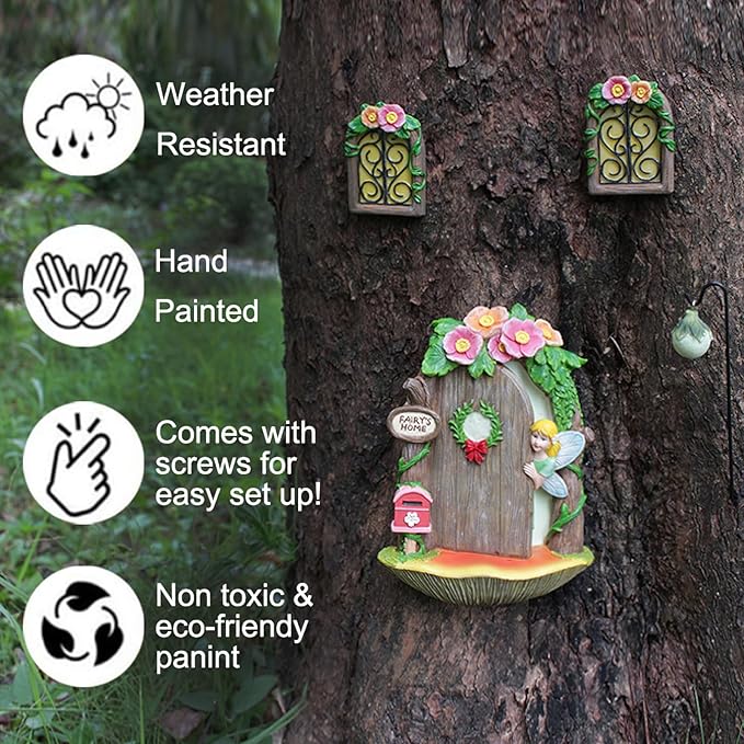 - ENCHANTING DESIGN: Magical fairy house door and window set that glows in the dark, perfect for creating whimsical garden displays on trees or garden spaces