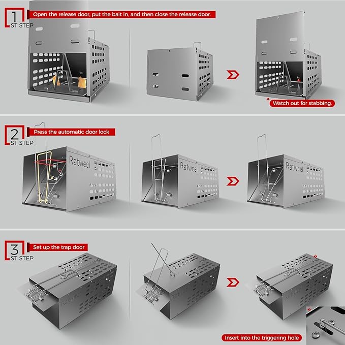 - 【Humanized Designed With Physical Mechanism】Independent bait settings can attract animals by smell. The cage can only enter. There is no sharp device inside. The rear door device is combined with the handle to facilitate your subsequent release, ensuring that people do not come in contact with animals during the release process, and reducing discomfort caused by contact