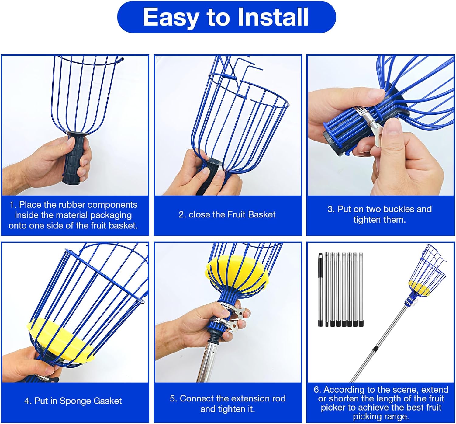 - 【Tool-Free Assembly】 Assemble this telescoping fruit picker in 3 minutes - simply twist-lock the desired number of poles and hand-tighten the upgraded mango grabber basket. No wrenches or screwdrivers needed. Foam-padded basket base prevents bruising on delicate fruits like persimmons and pears during harvest.