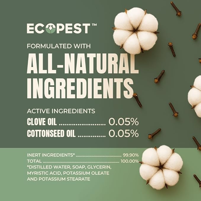 - ALL-NATURAL FORMULA, FAMILY AND PET FRIENDLY. Tough on bed bugs, gentle on you. Made with natural essential oils, including clove oil and cottonseed oil, this botanical biopesticide provides peace of mind for those with kids and pets at home. Common synthetic pesticide ingredients can pose health risks like neurotoxicity and endocrine disruption and can be toxic to aquatic life, raising environmental concerns. Unlike conventional pesticides, this spray is free of synthetic pyrethroids so it’s safer for your home, your family, your pets, and the environment. Effective pest control without compromise.