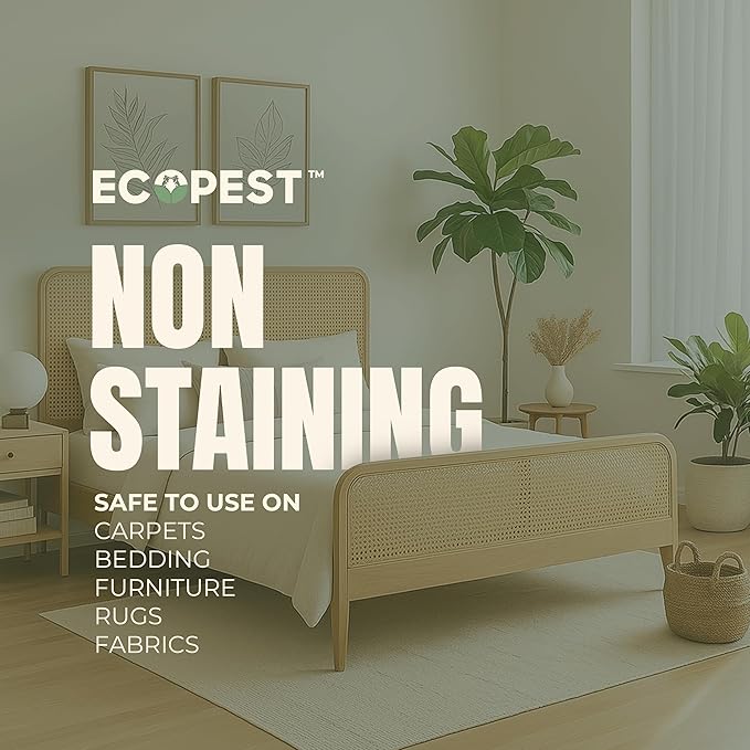 - NON-TOXIC AND NON-STAINING. Safe to apply to any surfaces that won’t be damaged by water alone. The spray can be safely used on counters, floors, bedding, furniture, clothes, and other surfaces. Avoid conventional products that can cause staining and leave residual chemicals around your home. Our bedbug control solution is designed to be gentle on your belongings and tough on pests. Ideal for sensitive areas like kitchens, bedrooms, and living rooms. No added dyes or fragrances and made for both indoor and outdoor use. Safe for your home, deadly for bed bugs.