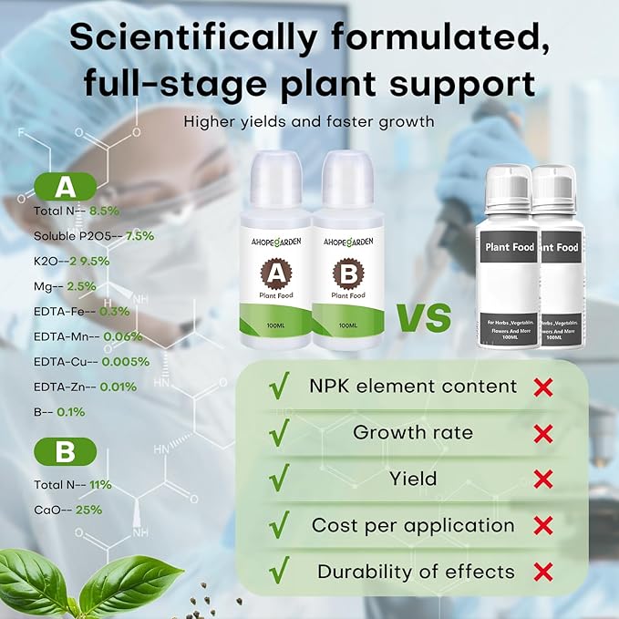 - A&B Nutrients Plant food:Clean, Complete, No Precipitation. Two bottles + two refill total 400ml, Indoor Grow Kit deliver a perfectly balanced N-P-K formula with added amino acids and humic substances. 100 % water-soluble, residue-free, and effective through every growth stage—seedling to harvest. Ideal for both hobby and professional hydroponics.