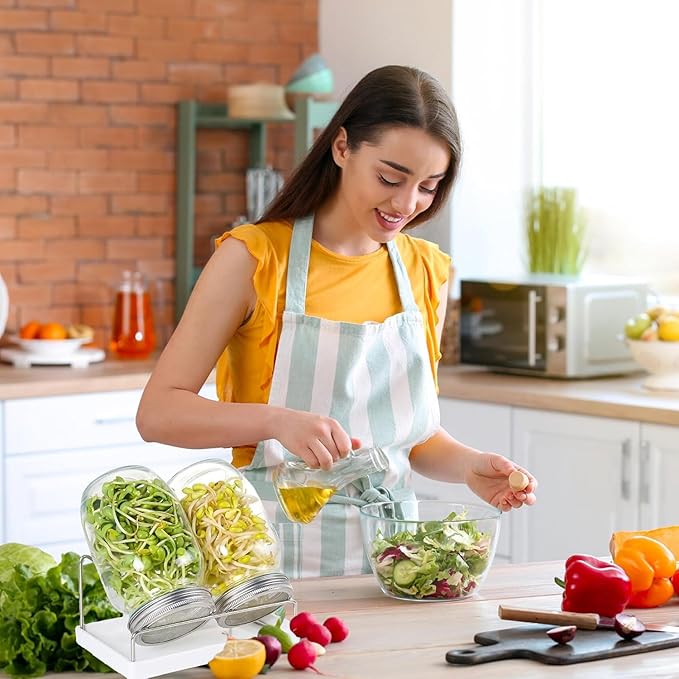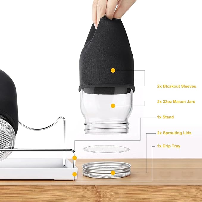 - COMPLETE SPROUTING KIT - Includes 2 Glass jars, 2 screen sprout lids, 1 stainless steel stand, 1 drip tray, 2 blackout sleeves.(SEED NOT INCLUDED)
