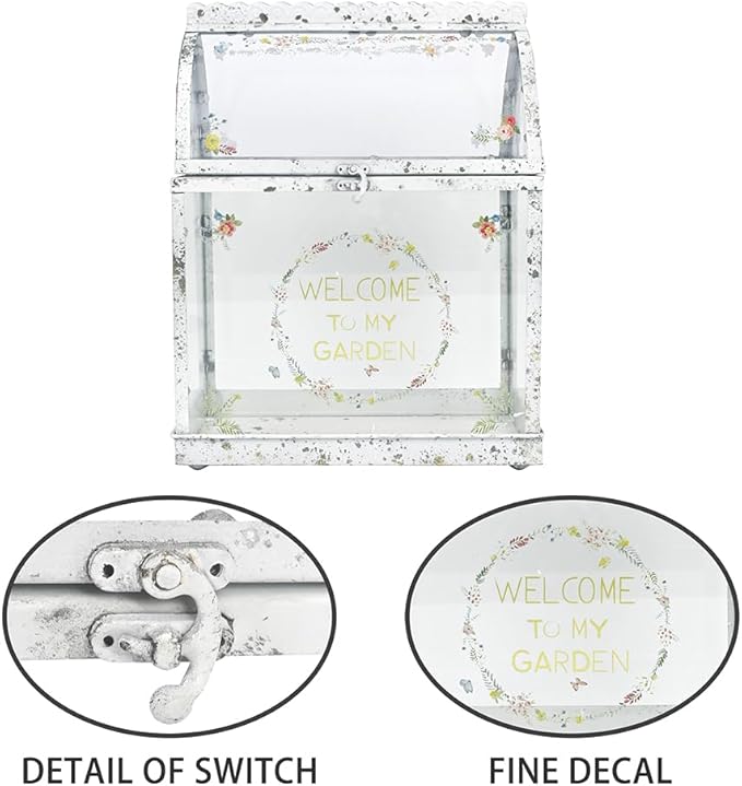 - 【Charming Garden - Inspired Design】:This glass storage box features a “WELCOME TO MY GARDEN” print with delicate floral patterns, adding a whimsical, rustic touch to your home decor. The distressed white metal frame and arched glass top mimic a mini greenhouse, perfect for blending into garden - themed spaces or brightening up living areas.