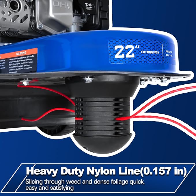 - DURABLE STEEL DECK & WIDE CUTTING PATH: Built with a heavy-duty one-piece steel deck for enhanced stability and reduced vibration. The 22-inch cutting diameter with tough nylon line clears a wide swath in a single pass, saving time and effort.