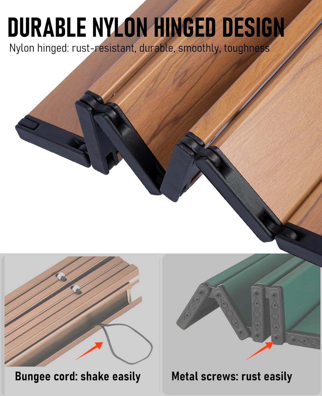 - Durable Nylon Hinged Design – Unlike other similar tables that use metal screws that rust easily or bungee cord that shaking easily, WildCall camp table use nylon hinged to connect each panel of the table, which is not only rust-resistant and durable, but also makes the table fold more smoothly and toughness