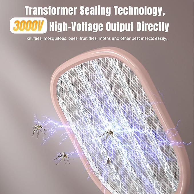 Electric Fly Swatter Racket 3000V Bug Zappers, Mosquito Zappers USB Rechargeable, 1200mAh Mosquitoes Killer Lamp & Fly Zappers with 3 Layer Safety Mesh for Home, Bedroom, Kitchen, Patio (1Pack-Pink)