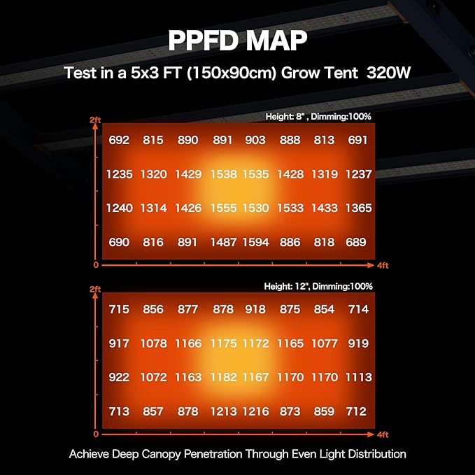 - 【High Efficiency and Energy Saving】 The 320w led grow light is highly energy efficient. market-leading 2.8µmol/J PPE, Max 2.5g yield/watt, 320 watt with smaller footprint for better crop quality, more cost-effective. Our grow light can save more energy while maximizing plant growth and yield.