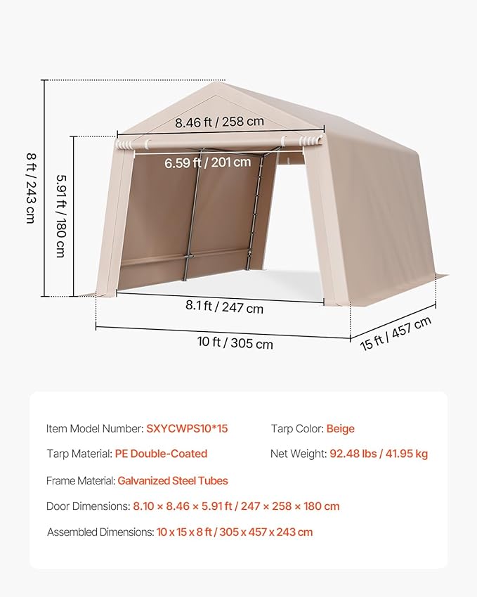VEVOR Outdoor Storage Shed, 10 x 15 ft Portable Storage Tent with 2 Roll-up Doors & Vents, Waterproof Canopy Shed Shelter, Heavy Duty Frame, Patio Garage Carport for Motorcycle Lawn Mower, Beige