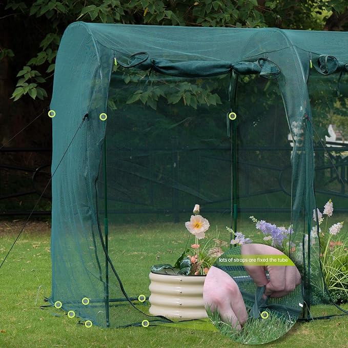 - Product Features-Our plant gardening net cover has three roll-up doors,smooth double-PVC zipper design easy access to every section,also included ground pegs & ropes enhanced stability and wind resistance for secure protection