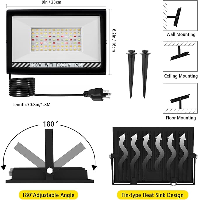 - 3 Types of Installation: No wiring is needed—just plug it in! You may mount an outdoor LED floodlight with a 180° body that can be adjusted on the ground, wall, or ceiling. This LED floodlight is a good option if you're searching for a sustainable solution to illuminate your patio, garden, and backyard
