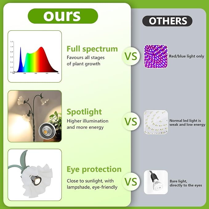 - [Comes with 3 Grow Light Bulbs]: the grow light is made of aerospace aluminum, which improves the heat dissipation efficiency and is more durable than ordinary plant bulbs. the COB light source design comes from the LED light optimization upgrade, which can save more power spending under the same conditions. At the same time plant light CRI up to 98 +, can make look plants more vivid and beautiful.
