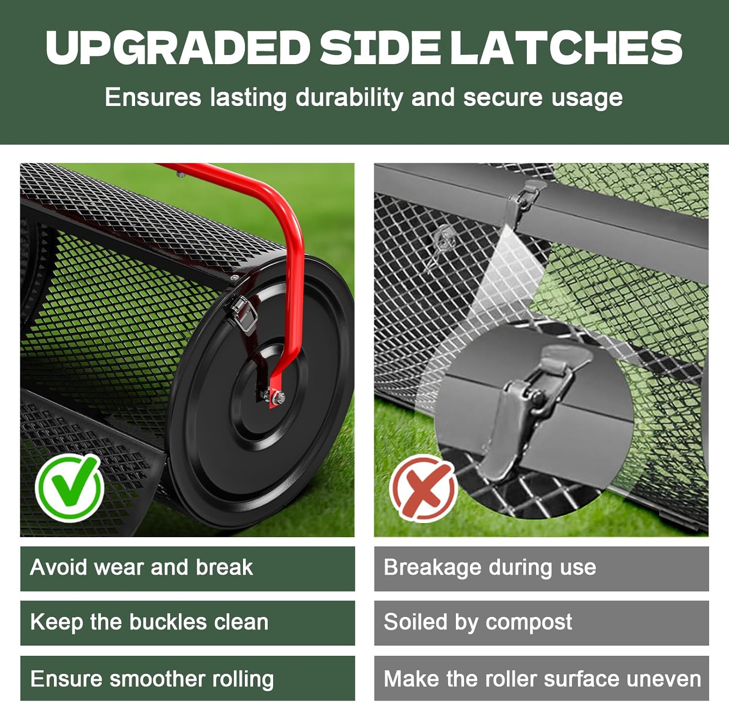 - [Thickened Diamond-Shaped Mesh] Built with a thickened diamond-shaped metal mesh, this Compost Spreader stands up to rugged use. The powder-coated steel frame adds corrosion resistance, ensuring long-term performance of your compost spreader for lawn.