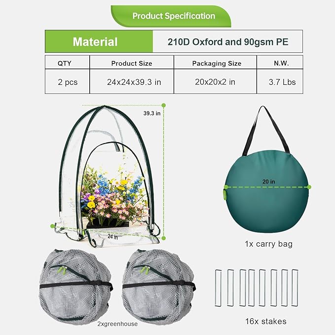 - HUMANIZED DESIGN -The pop-up greenhouse is very easy set up featuring humanized design with 4 large zip-able front/back roll-up doors. It includes 2 mesh windows with PE/mesh fabric for better ventilation, 2 fiberglass poles and triangle imitation roof design preventing rain/snow buildup