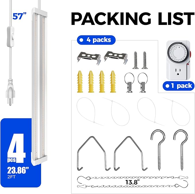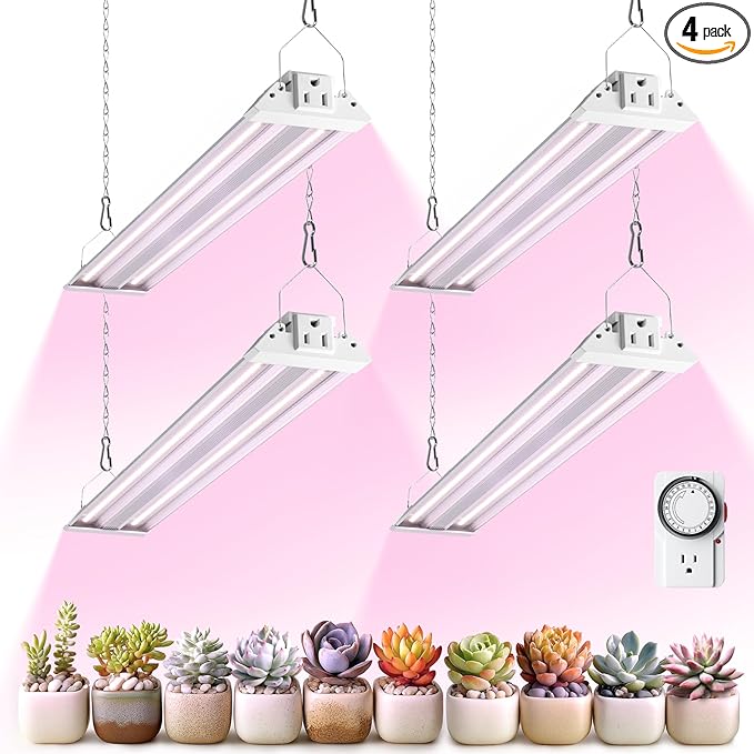 Barrina TX36 2FT Grow Lights for Seed Starting, 144W(4 x 36W, 800W Equivalent), High PPFD, Full Spectrum, Mechanical Timer, Grow Light for Indoor Plants with On/Off Switch, Linkable, 4 Packs