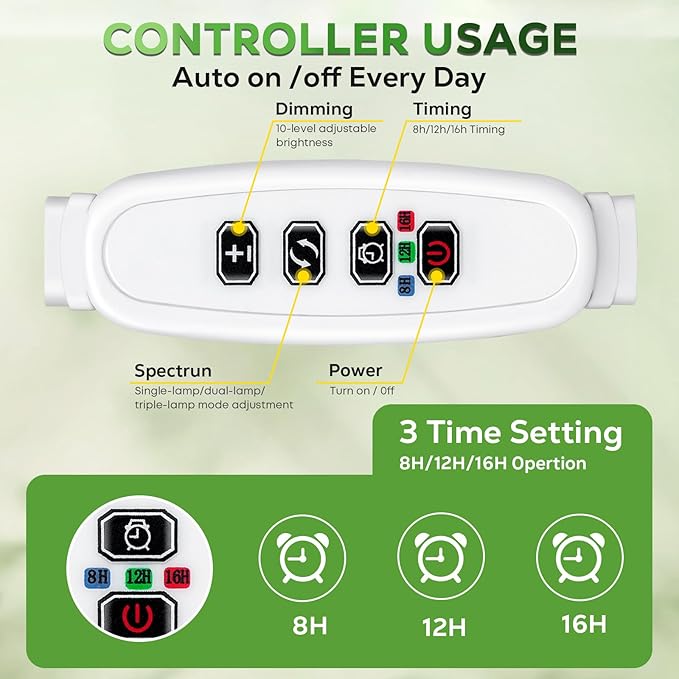 - Auto On/Off Timer: With automatic cycle memory timing function, the grow light automatically turns on/off every day after setting, 8/12/16 lighting time modes to choose from. The plant light will turn it on by itself everyday as your setting, you will no longer have to worry about your plants when you are not at home.