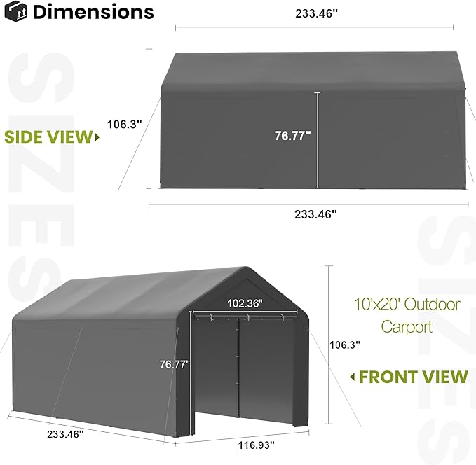 - 【UV & Weatherproof Canopy】This 10x20 carport is made of heat-sealed, triple-layer 200g polyethylene fabric, which is Anti-UV, waterproof, tear-proof, and can protect your car or boats against all four season elements, like sun, wind, rain, dust, hail, and snow.