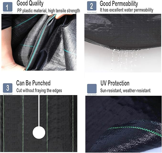 - 【Weed Barrier Fabric Heavy Duty】 Made from 4.23 oz high-density PP plastic, it is thick and tightly woven, with excellent tear resistance. Whether it is daily trampling, scraping from gardening tools, or piercing from plant roots, it can easily withstand it. PP material is acid and alkali resistant, UV resistant, and does not easily become brittle or age even when exposed to the outdoors for a long time, with a service life far exceeding that of ordinary weed control fabric