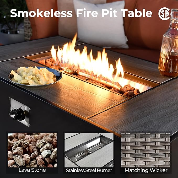 - FirePit Table Included: Comes with a 42 inch rectangular convertible propane gas fire pit table. Night time use it as a fire pit table to add atmosphere. Day time use it as a tall Dining table with the burner lid. Stainless Steel Burner withstands all weather. CSA certificated for safety.