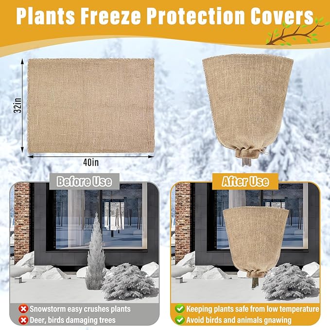 - Package Include: You will get 4 pcs winter burlap covers for plants, size 32×40 inch. The burlap plant frost protection bags are designed to protect outdoor upright plants and potted plants, they can against winter cold and frost, also serves as a physical barrier keep out birds and animals from gnawing, providing a full protection for your plants! We suggested you choose sack size larger than plants for meet growth.