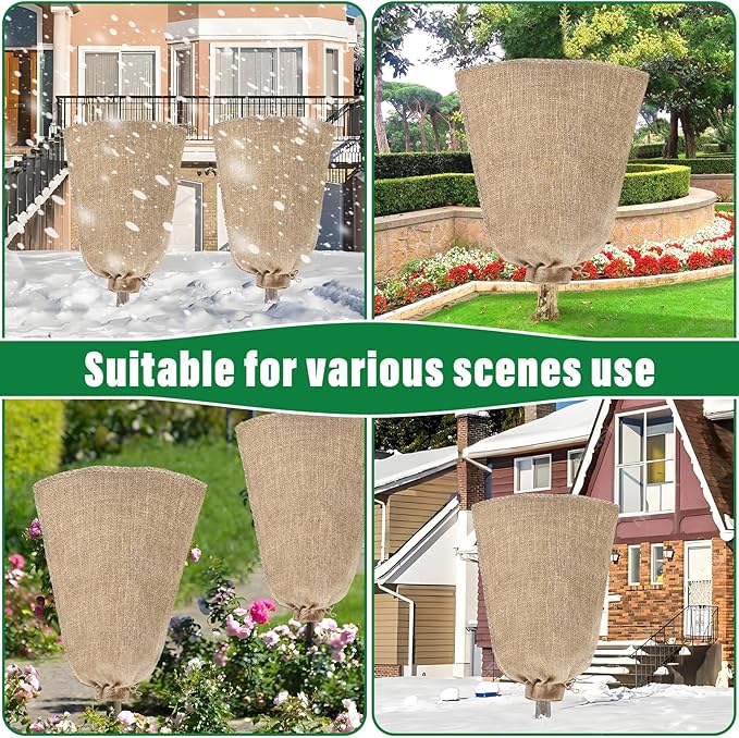 - Easy to Use and Adjust: Wide opening design is easy to put on and take off, and installation is simple, just place the burlap plant cover over the plant or pot bottom, pull tight and tie the ends. The practical drawstring design can be adjusted in size at will, it helps burlap sack to fit tightly to the plant and stop cold air from entering from below, and won't blow away even in windy weather.