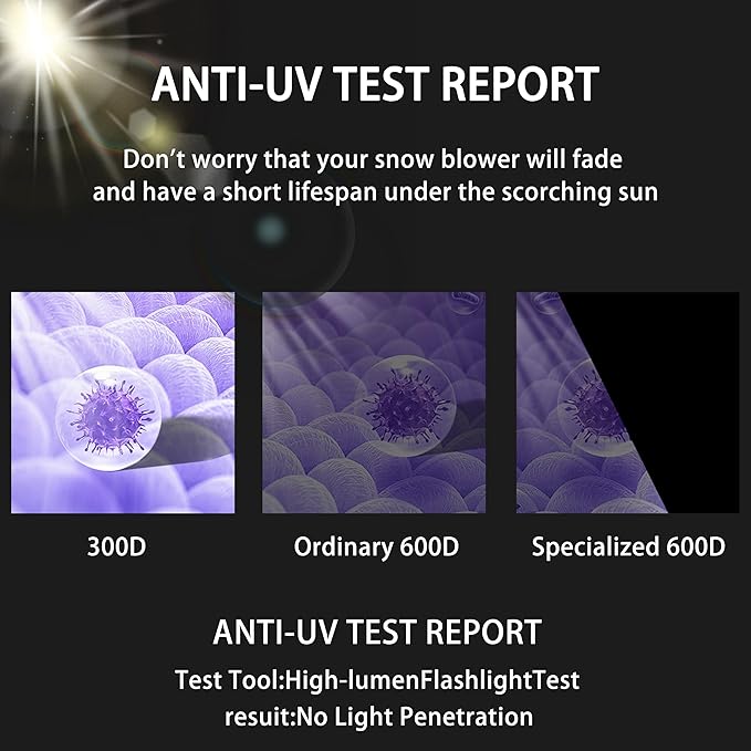 - 【Durable Waterproof Material&heavy-Dduty Fabric Design】:Our snowblower covers waterproof outdoor Constructed with high-quality 600D Oxford fabric + PU coating,it is highly waterproof and tear resistance,color retention,the cover on your self propelled snow blower machine, capable of withstanding sunlight,rain, snow, frost,sand,dust,leaves,resin,debris and bird droppings,providing long-term protection for the vehicle. snow blower covers from rusting due to damp conditions