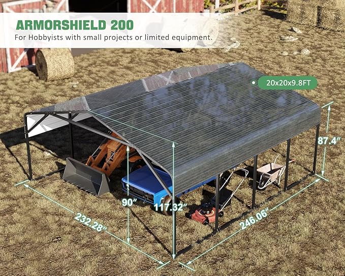 - Fits 2 Full-Size Trucks + Storage (20'x26'x9'8") Massive 20'x20' coverage—drive-in RV (7ft clearance) or stack ATVs. Extra-high 7'5" entrance vs. standard 6'10"