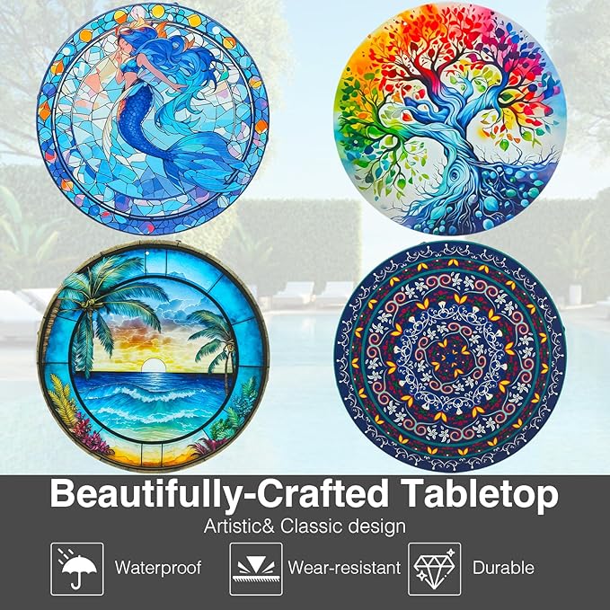 - 🌿High Quality Metal Patio Side Table: This metal side table top offers a stunning blend of colorful top with an elegantly curved black steel frame, blending with any room decor. With rust-proof coating design, it is fit perfectly into the outdoor environment. Easy to assemble